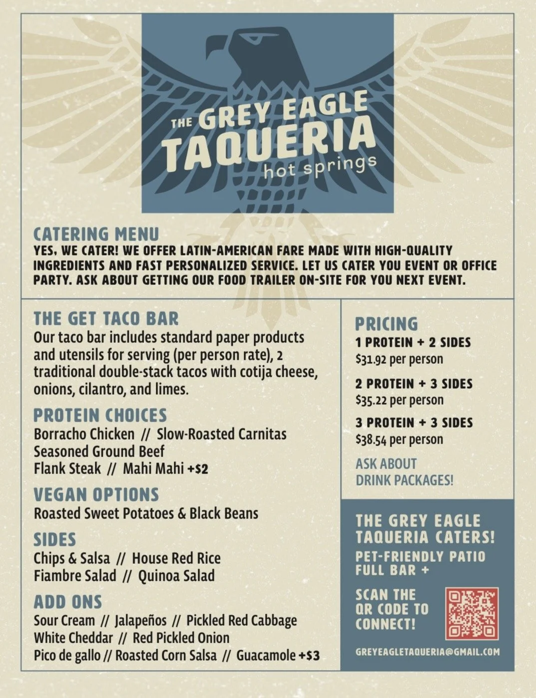 The Grey Eagle Taqueria is open and we’re excited to bring you an updated menu at both locations. Updated signature tacos, and more!
